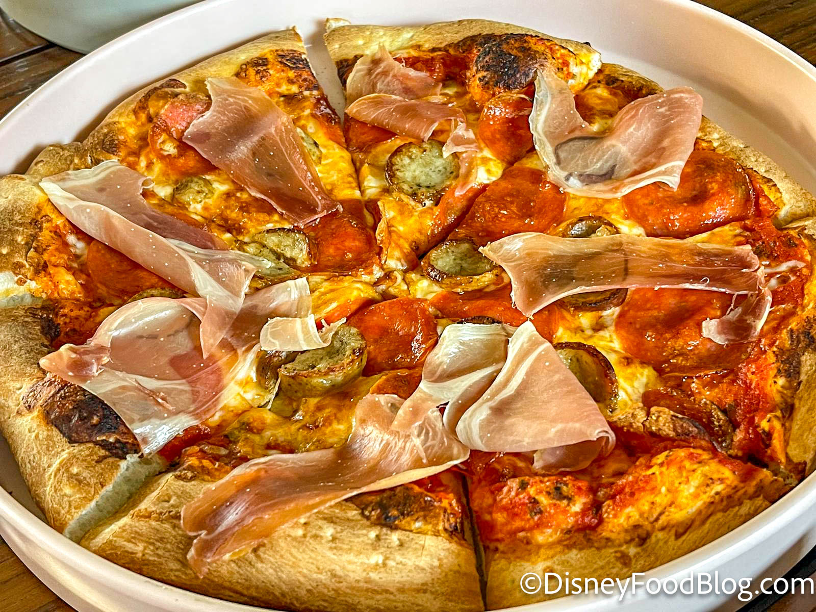 Finally, we ordered the Charcuterie Pizza for $24. It’s Artisan Cured Prosciutto, Pepperoni, Sausage, and Sun-dried Tomato ON A PIZZA. Charcuterie on a pizza. That’s brilliant!!! It’s an excellent pizza that’s not too greasy and has a LOT of toppings. The sauce was JUST right and balanced well with the rest of the ingredients. So basically, it’s a charcuterie board with an edible board (we can’t even).