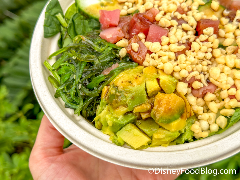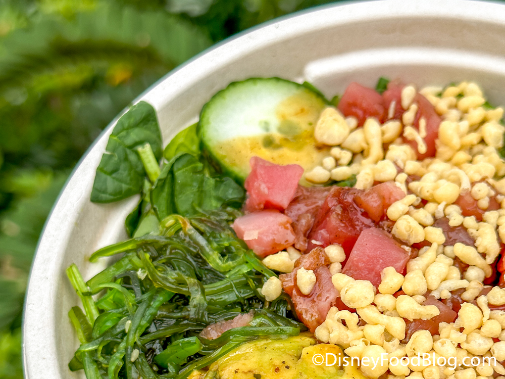 The Ahi Tuna Poke is made with fresh tuna, spinach, carrots, avocado, cucumber, seaweed salad, tempura crunch, and spicy poke sauce and costs $14.