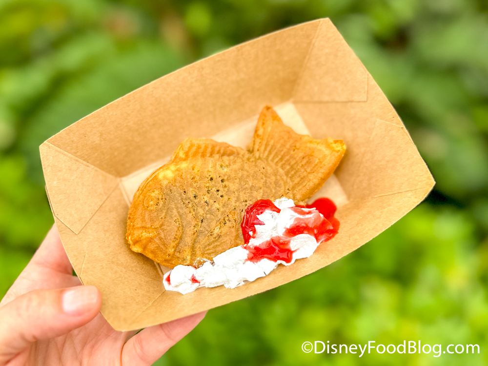 Lastly, the Taiyaki, another Japanese street food item, is a sweet red bean-stuffed pastry topped with Bavarian cream and strawberry sauce and costs $6. Just look at how cute this thing is!
