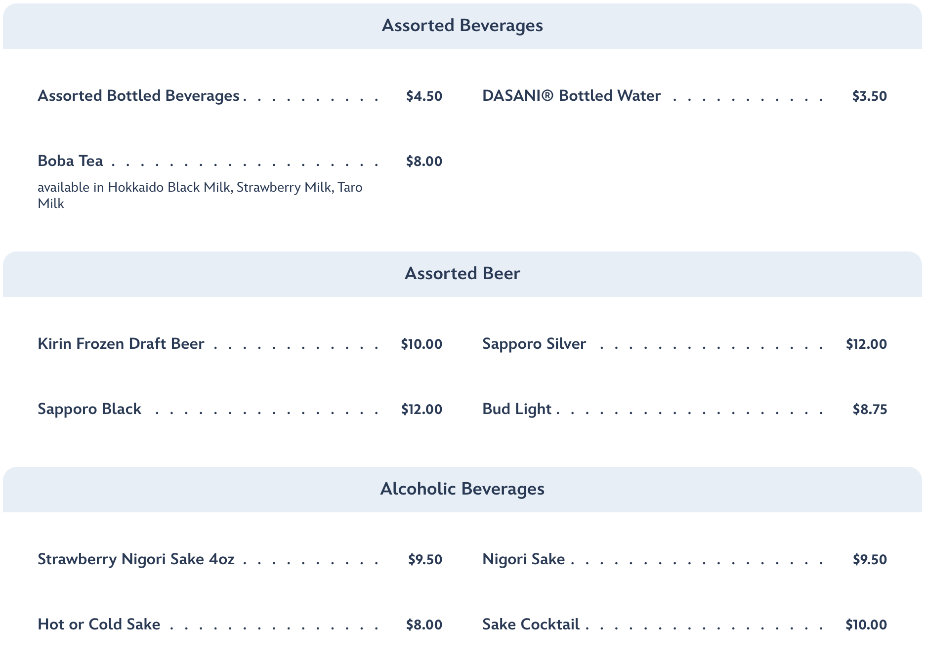 They also have a variety of drinks, like Boba Tea, Assorted Beer, Sake, and a Sake Cocktail.