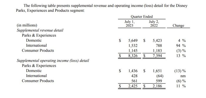 Disney Parks, Experiences, and Products revenues for the last quarter increased 13% from around $7.4 billion in July 2022 to $8.3 billion in July 2023. The increase, in large part, is due to better results in non-U.S. Disney Parks. The quarterly report credited major growth at Shanghai Disney Resort and growth, albeit to a lesser extent, at Hong Kong Disneyland Resort. Shanghai Disney was closed last year due to COVID-19, so obviously there was nowhere to go but up. As for Hong Kong Disneyland, results showed more guest spending in high volumes. Prices across the Disney Parks have also increased, resulting in more income.