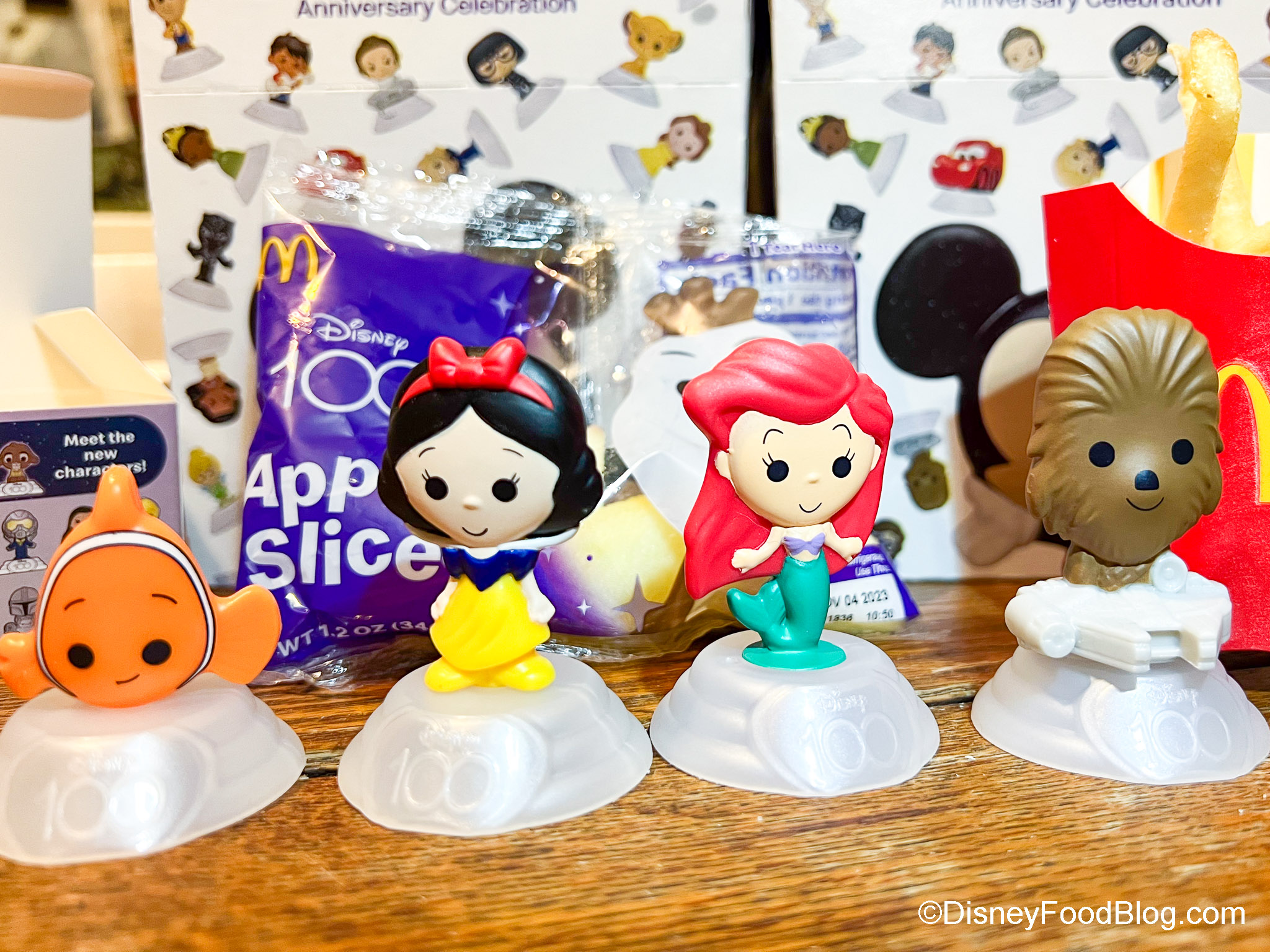 Now, when we say a lot, we mean A LOT. So, if you’re looking to see what toys we’ve collected. Well, we’ve built a literal army of Disney100 characters! You get two toys per meal, so to collect ALL of the characters, we’ll need to buy over 100 Happy Meals. We most recently got Nemo, Snow White, Ariel, and Chewbacca. Seriously, y’all, this is ADDICTIVE.