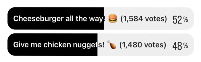 Here’s how it started. We took to Instagram and asked our readers: When ordering a Happy Meal, are you Team Cheeseburger or Team Chicken Nuggets? Four minutes into the poll, the results were leaning in favor of Team Chicken Nuggets.
