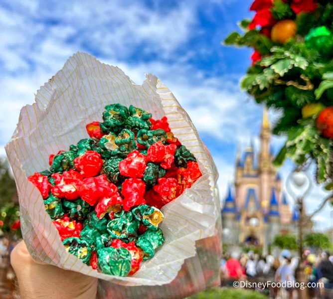You know the station towards the back of the shop that has the popcorn, right? This is where you can get a bag of delicious popcorn or make your own custom popcorn mix. Well, a new popcorn flavor has entered the chat — it’s red and green, so, yes, HOLIDAY POPCORN IS HERE!