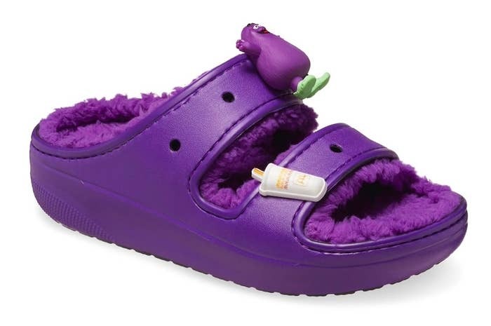 However, we think the shoes that will probably sell out the quickest will be the Grimace Crocs. Grimace is a social media ICON, thanks to McDonald’s special Grimace Shake. Grimace is super popular right now, so, OF COURSE, he got his own pair of fuzzy Crocs slides.