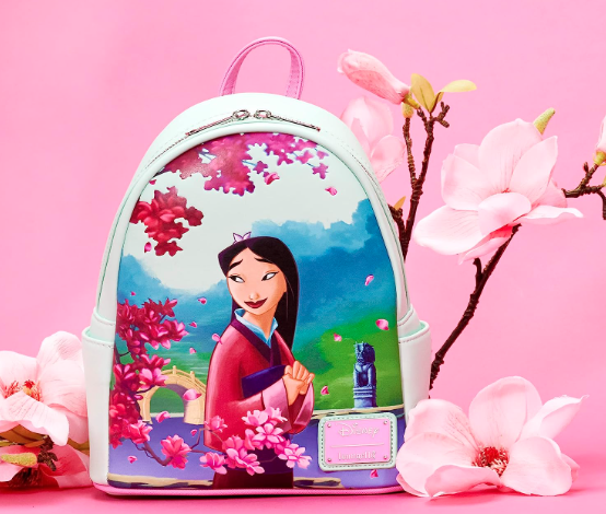 Celebrate the 25th anniversary of Disney’s Mulan movie with this Mulan Loungefly backpack. It features the titular character in her family’s garden, under a cherry blossom tree.