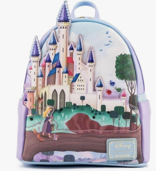 This Disney Princess Loungefly backpack features Sleeping Beauty in front of her castle. You can spot the three fairies and lots of woodland friends.