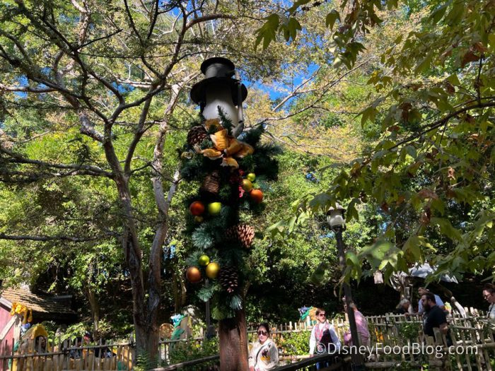 Here’s a closer look at this woodland-inspired holiday decor on the light posts next to The Many Adventures of Winnie the Pooh. The theming is certainly more rustic than the rest of the park!
