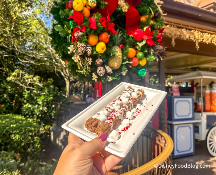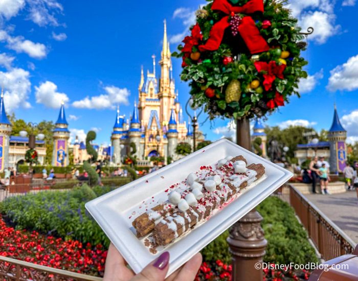 Churro rolled in Hot Cocoa Powder and topped with Marshmallows and Peppermint Candy Pieces for $7 ☕️❤️🤍 pic.twitter.com/jvuSqRP5Fd— Disney Food Blog (@DisneyFoodBlog) November 9, 2023