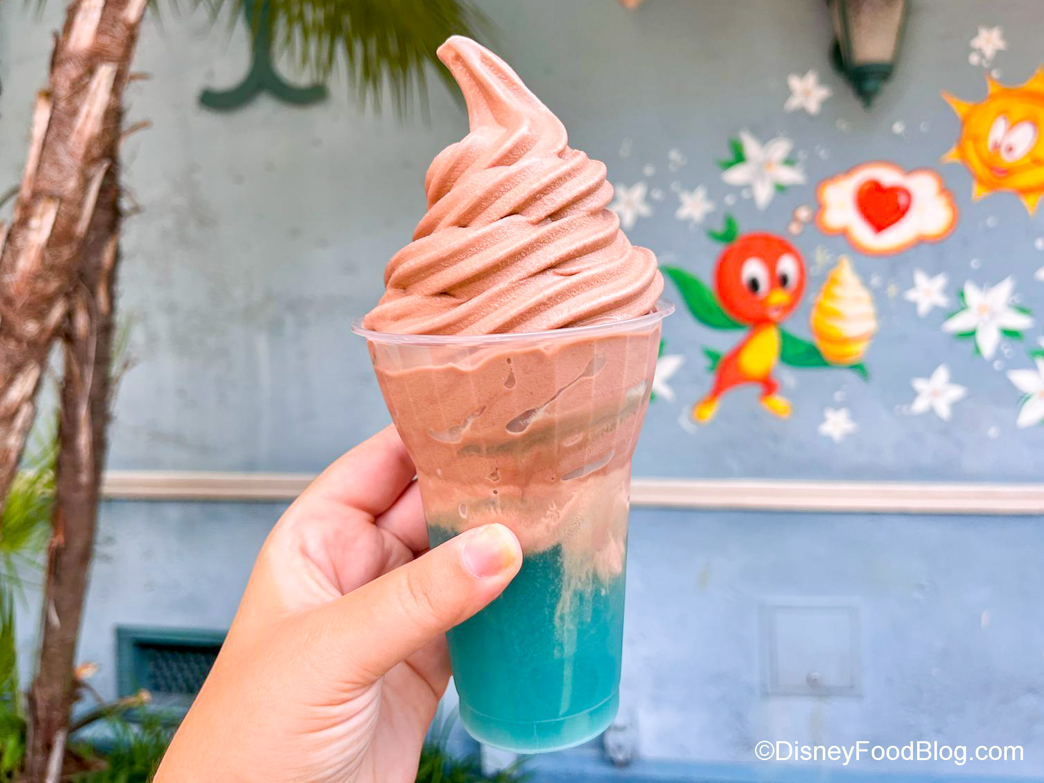 Yes, we also cringed just reading that title, but the truth is, we’ve tried it. A few months ago for an “experiment,” one of our reporters got the Powerade Mountain Berry Blast Float from Sunshine Tree Terrace, which comes with your choice of Dole Whip or soft serve ice cream. To make the grossest combination possible, we got Powerade with chocolate soft serve.