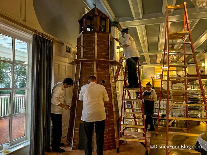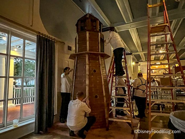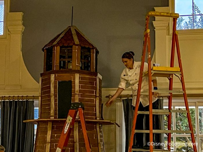 The lighthouse, fully composed of gingerbread, stands nearly two people tall! As you can see, it takes a couple of ladders to ensure this fun display comes to life.