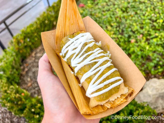 This snack had SUCH a good flavor — we loved the tomatillo salsa verde. It was fresh and spicy but had a mild spice level overall. The masa shell isn’t dry at all — it was moist and was a nice complement to the beef inside. Grab one for $9.
