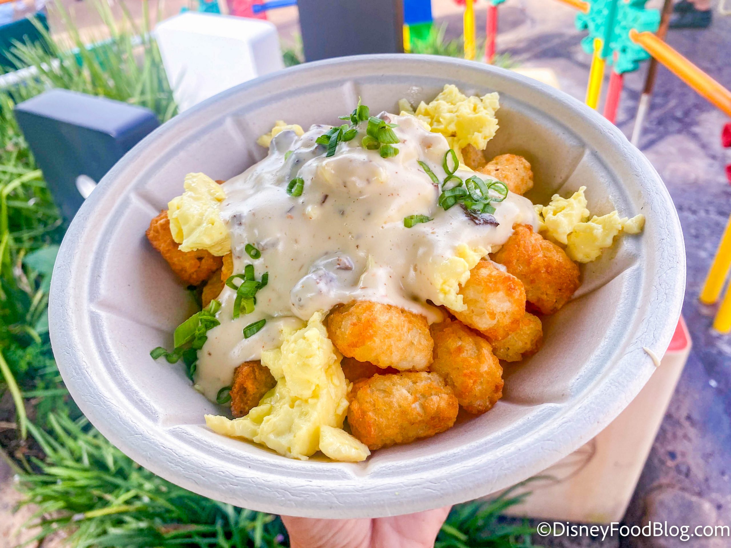 You can find the adult Breakfast Bowl at Woody’s Lunch Box ( in Toy Story Land in Disney’s Hollywood Studios) for $8.79. The bowl is packed with potato barrels, smothered in smoked brisket, scrambled eggs, and country gravy. The finishing touch is the green onion garnish on top. A kid’s version is also available for $5.49.