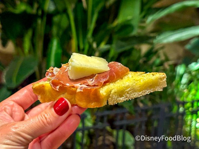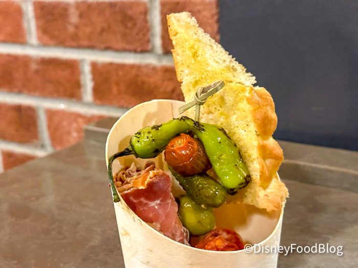 Next, let’s try the Charcuterie Cup. This comes with Manchego cheese, chorizo, serrano ham, pickled vegetables, olives, and toasted focaccia bread.