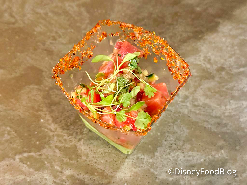 First up is the Tuna Ceviche. This dish includes marinated ahi tuna, pico de gallo, and avocado cream topped with cilantro.