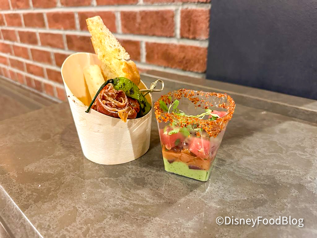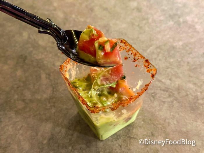 Ceviche is a seafood dish where diced cubes of raw fish, marinated in a lemon or lime juice mixture, react with the citrus juices to cure the fish protein and cause it to become opaque and firm while absorbing flavor and is traditionally from South America. We REALLY liked this dish. The tuna was fresh, buttery, and had a smooth and creamy avocado sauce with it that cooled off the spicy tang of the pico de Gallo. The rim of the cup had a chili lime seasoning that provided some extra spice, too. We really liked this one!