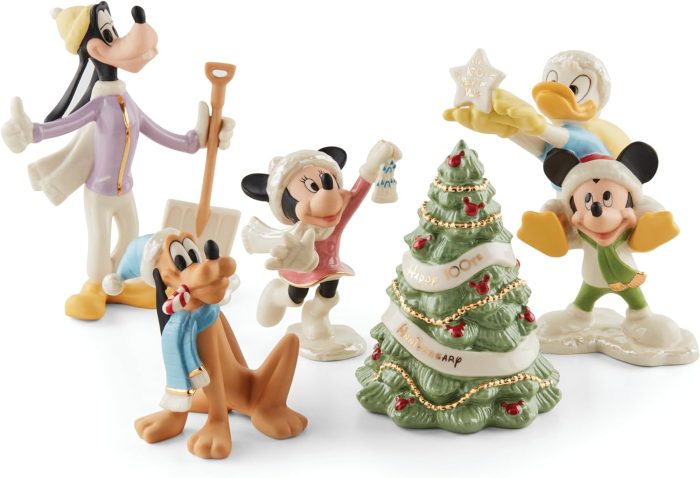 These figurines are perfect for your Christmas decor and for celebrating Disney100. This set of 5 includes Mickey Mouse, Donald Duck, Minnie Mouse, Pluto, and Goofy, each winter-ready and in their holiday best! Also, there’s a Christmas tree with a Disney 100th anniversary sash.