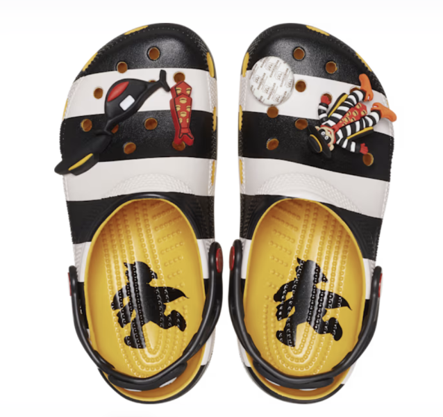 The Hamburglar Crocs are classic clogs with black and white stripes. They come with a Jibbitz of the Hamburglar’s go-to order (a burger).