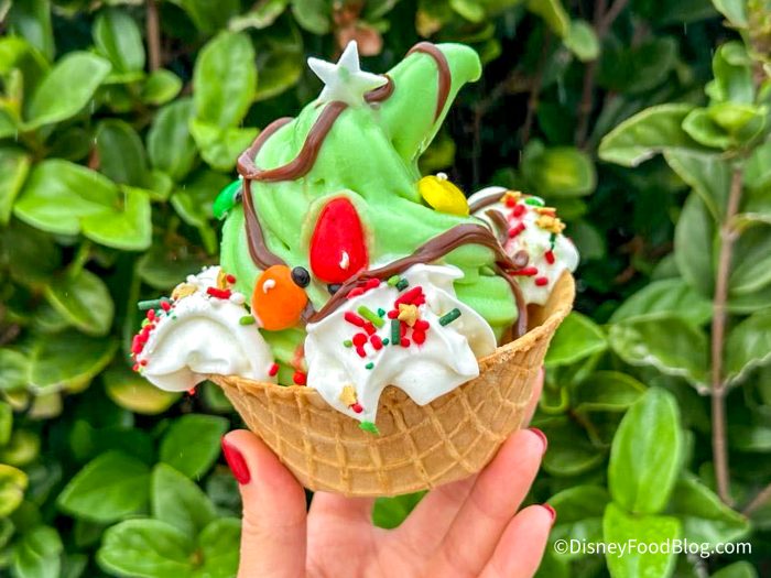 First, we were excited to try the Christmas Tree Sundae. This is a pistachio soft-serve in a waffle cone bowl with whipped cream, sprinkles, and candy Christmas lights. It looked beautiful in the display.