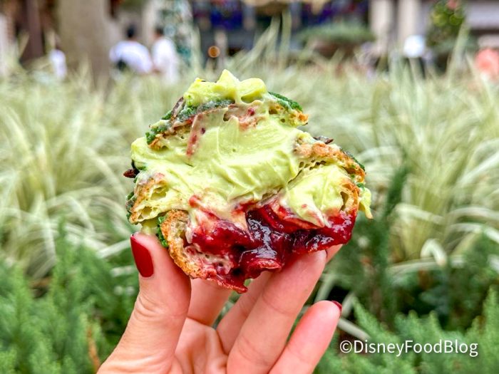 We’ll start with the Christmas Tree Puff, which is a pistachio cream puff that’s been layered with cranberry-cherry compote. Already, we were hoping that this would live up to expectations. That’s like, a seasonal charcuterie board just wrapped into a cream puff. Regardless of our hopes and dreams for this treat, can we talk about how cute it is?!