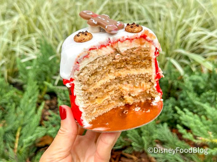 Next up, we have the Holiday Sweets Petit Cake, which is layer upon layer of spice cake, cream cheese icing, apricot jam, apple compote, and Italian buttercream. Oh, good heavens. This is like our dream cake. Can we also talk about how BEAUTIFUL this cake is?!