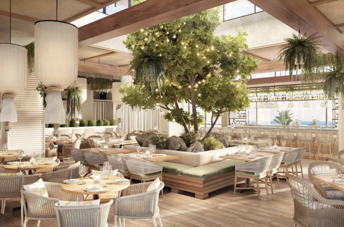 The design of the restaurant is meant to evoke the cool breeze of a summer day indoors, welcoming its diners to enjoy “sweeping views and a relaxing lakeside breeze.” The restaurant will host three bars, a dining room with a light, airy feel centered around a robust tree reaching upward toward the skylight, and the greenery spread throughout the restaurant was designed in collaboration with the Rockwell Group.