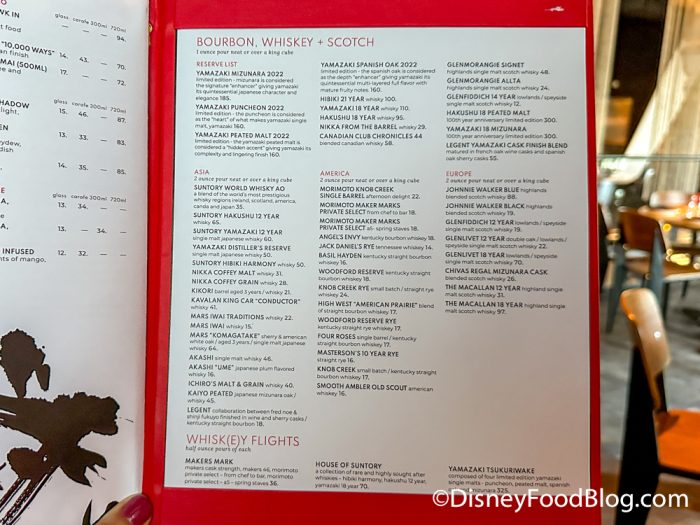 You can also order bourbon, whiskey, and scotch from Asia, America, and Europe in 1-ounce pours, as well as a Makers Mark whiskey flight or one of two Japanese whisky flights with three half-ounce pours each.