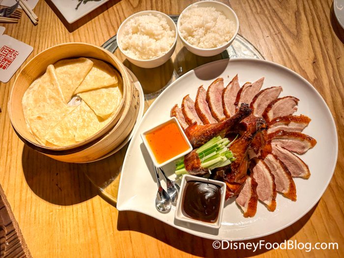 Lastly, dim sum, rice & noodles, meat & poultry, vegetables, and seafood options are offered on the menu. The restaurant’s most iconic dish, the Morimoto Peking Duck, is a carved house-roasted whole duck that is listed as serving two. Of course, we had to try it, so keep reading to see what we thought!