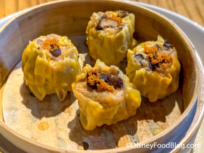 The Shumai, which are purse-shaped dumplings filled with pork, shrimp, mushrooms, and tobiko caviar, are served with a dim sum sauce and cost $16 for four pieces. They arrive at the table in a fun bamboo steamer basket.