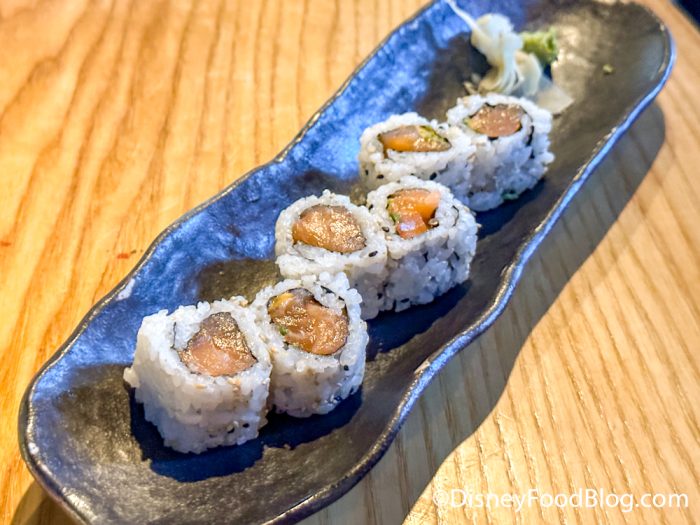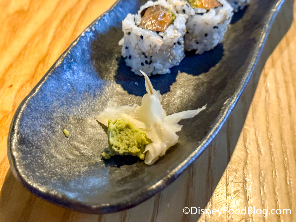 The ginger was fresh, slightly sweet, and earthy, and the wasabi was spicy and pungent — a great addition since the roll itself wasn’t so spicy.