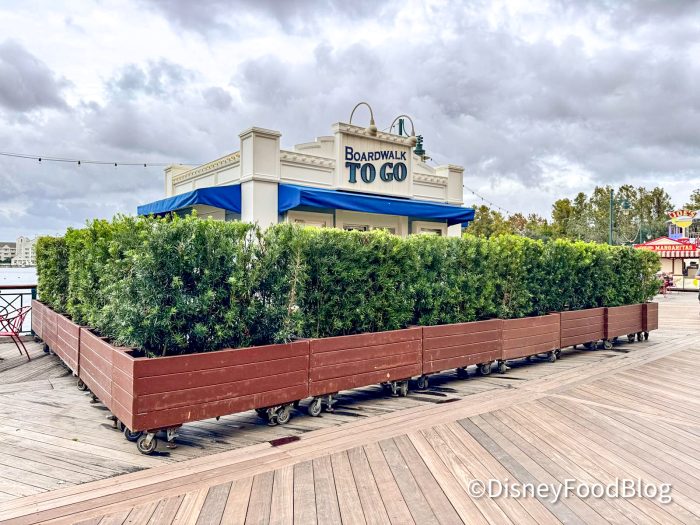 When we headed over to Boardwalk to Go, the future home of the corndog spot, we saw that there are now hedges surround thing the booth.