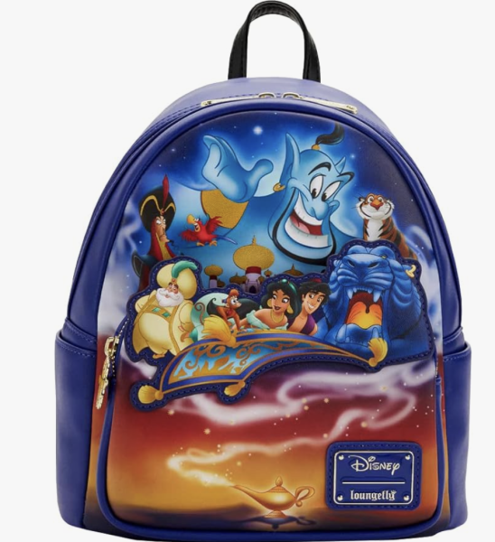 The Aladdin Loungefly Backpack has lots of characters on the front: Aladdin, Jasmine, Abu, Genie, Jafar, and more. The bag has side pockets and adjustable straps.