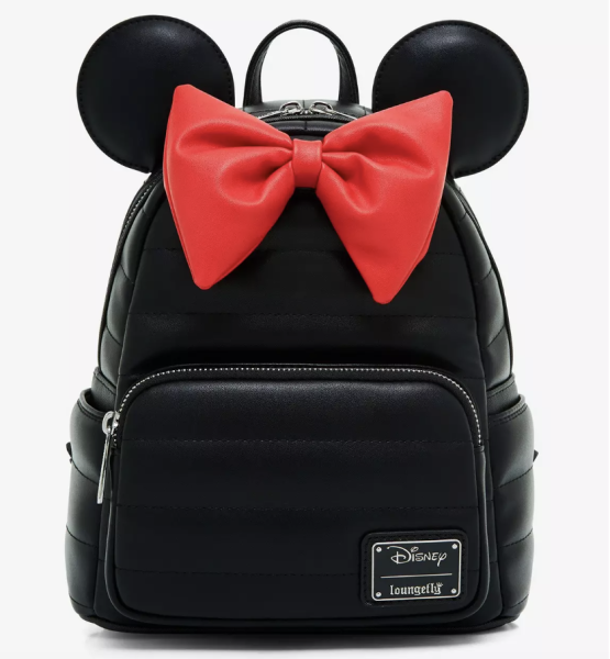 This Minnie Loungefly Backpack features a puffy texture with 3D ears and a big red bow. There’s a front zipper pocket, side pockets, and adjustable straps, too.