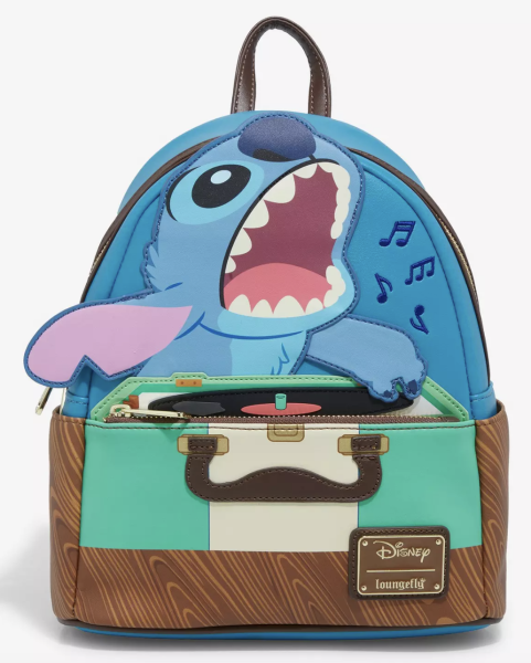 This mini backpack features Stitch holding his finger to a record player! The bag has a front zippered pocket, embroidered music note details, and a printed design of Scrump on the back.