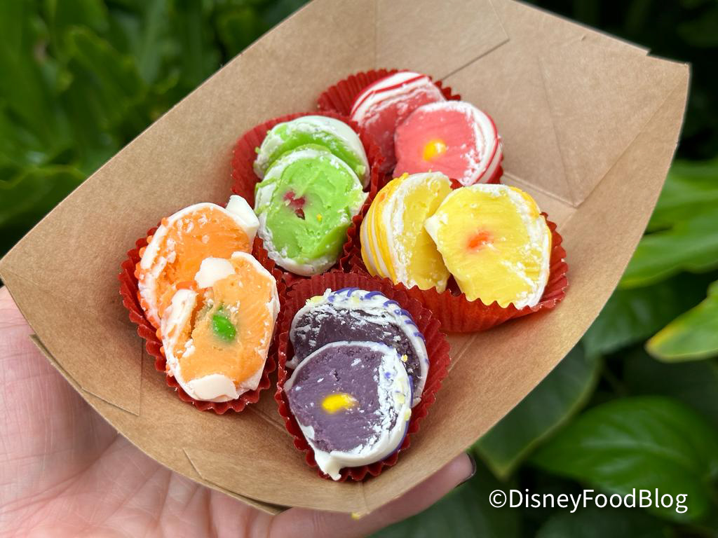 Well, they were definitely unique, with some flavors better than others. We personally loved the orange one, because it tasted like a creamsicle. The purple one, on the other hand, tasted like fake grape flavoring mixed with bubblegum and it was just NOT IT. The lemon one reminded us of a lemon Girl Scout cookie and we really liked that one, too. The green one is pretty mild and we could barely taste the apple. While the Cast Member said that she and several others raved about the Strawberry one, this particular reporter didn’t enjoy it. It really does depend on personal preference!