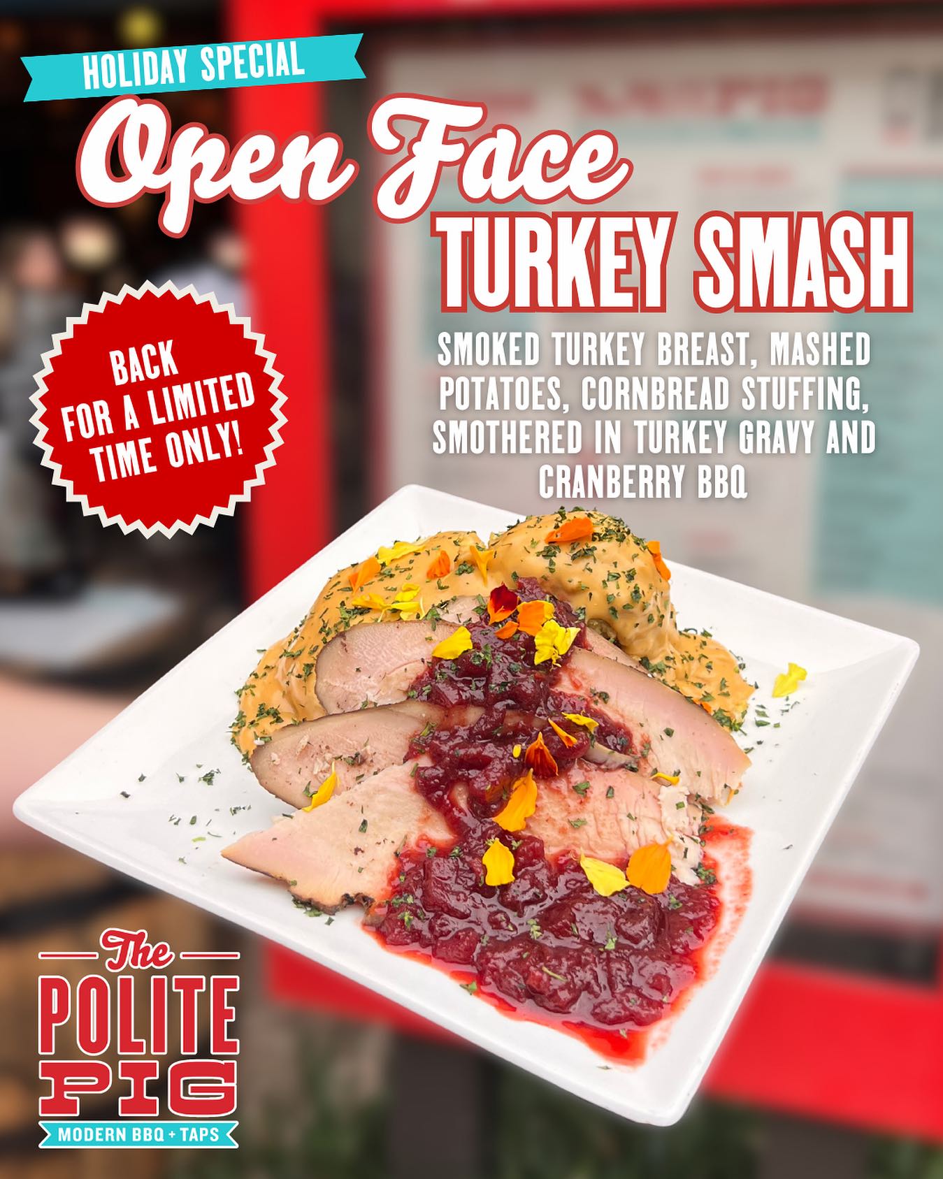 The Polite Pig is bringing back its Open Face Turkey Smash. It’s made with smoked turkey, mashed potatoes, and cornbread stuffing and drizzled with turkey gravy and cranberry BBQ sauce. Yep, it’s literally Thanksgiving dinner in every bite. YUM.