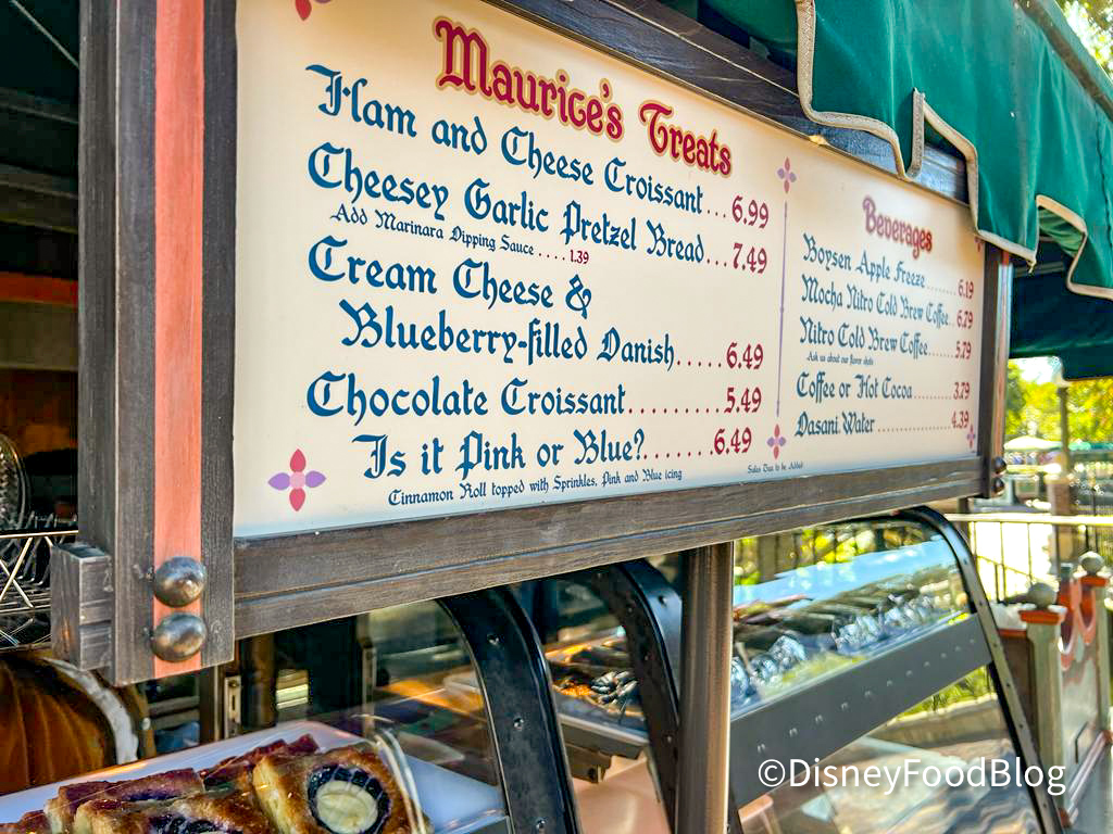 This Fantasyland snack kiosk serves up a variety of specialty sweets and frozen beverages, and is themed to Beauty and the Beast. Yep, it’s just like Belle’s father is truly there and serving up some treats to the village folk. So cute! We were walking by and noticed something NEW, and it looked so intriguing that we just HAD to try it. Come along with us!