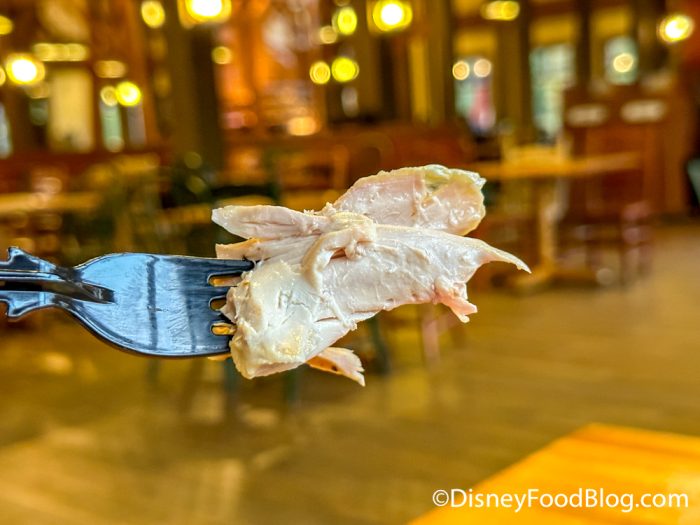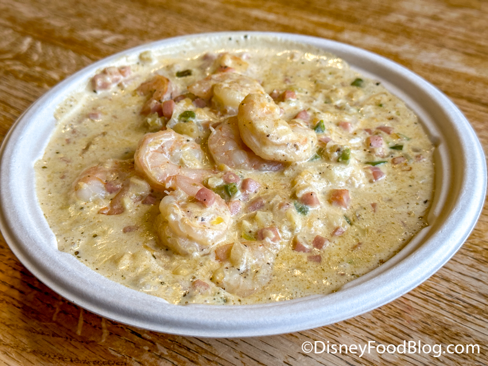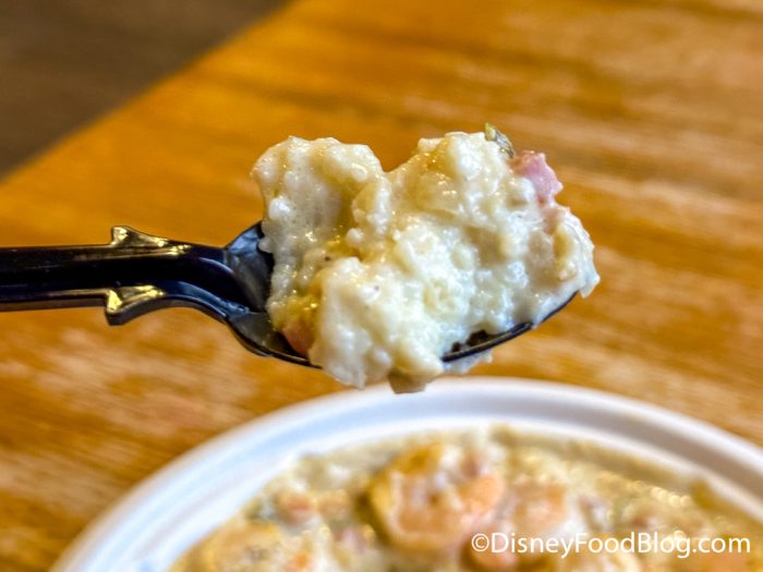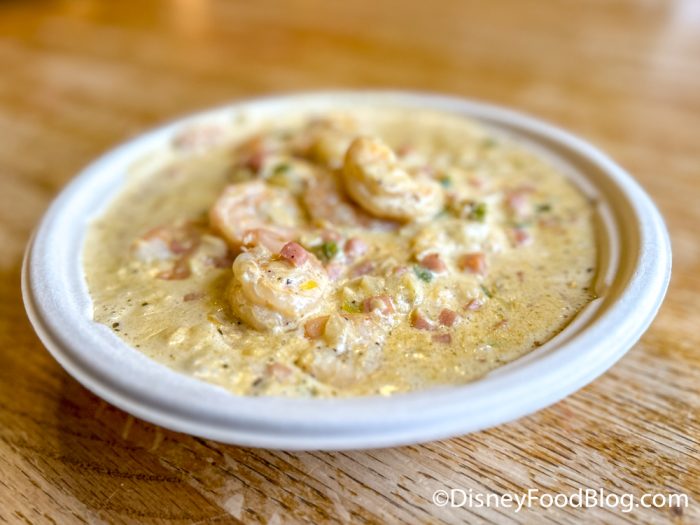 The shrimp were cooked perfectly — not overdone — and the bed of grits was soft but with a bit of that gritty texture you can expect from grits. This was a bit more of a cream sauce-based Shrimp and Grits than what I typically see around Disney World, which I loved, but keep that in mind if you’re not looking for something so heavy.