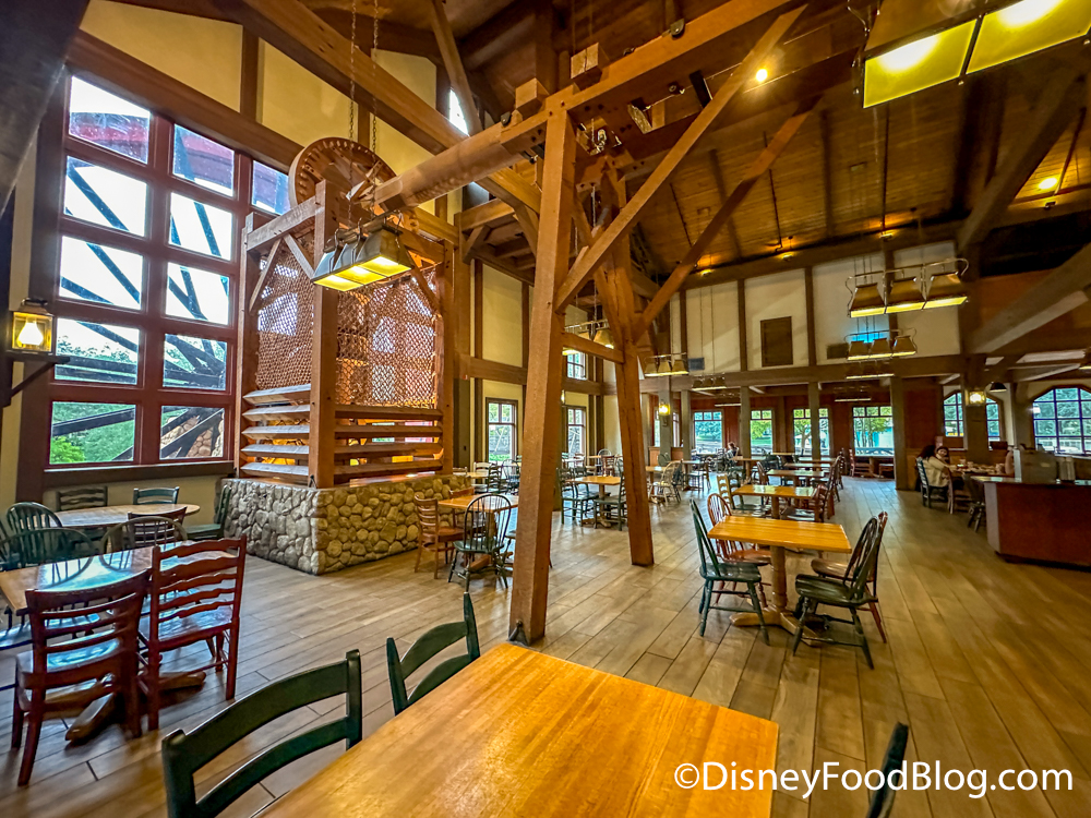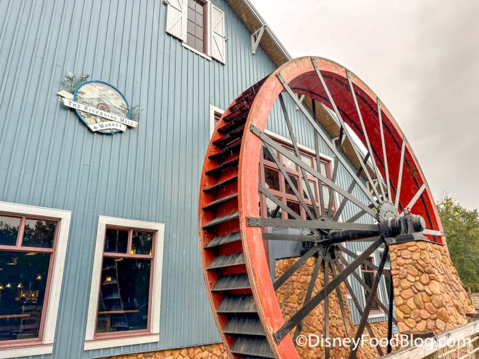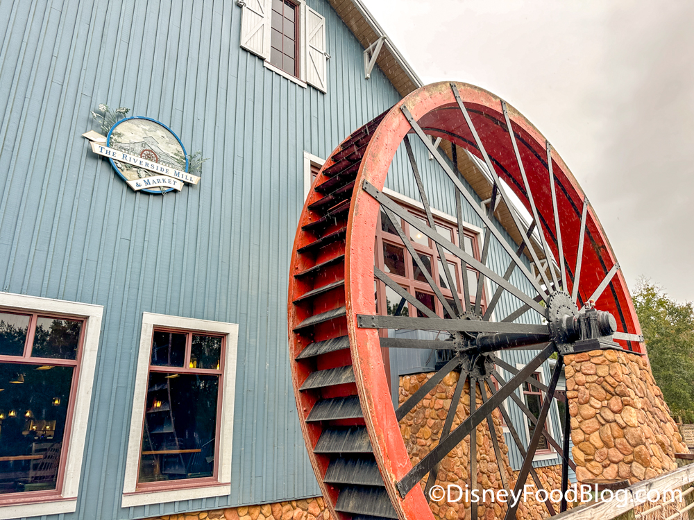 Riverside Mill Food Court sits on the Sassagoula River at Disney’s Port Orleans — Riverside. On the side of the building, you’ll see a 32-foot water wheel!