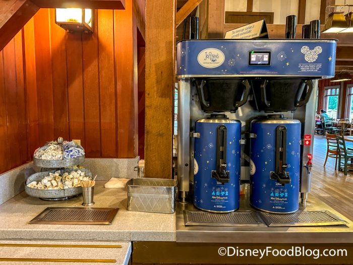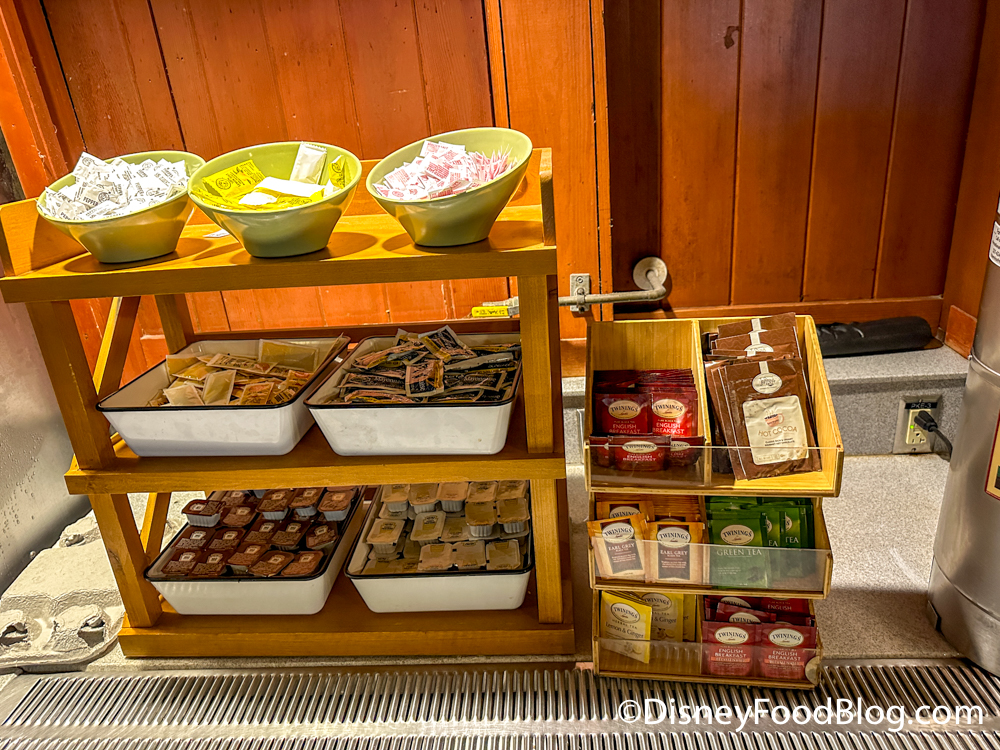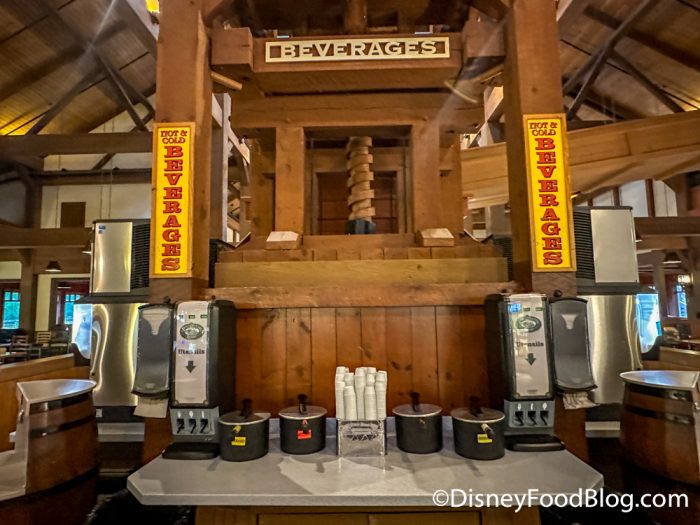In the center of the room, there is a large area for self-service options, like coffee…