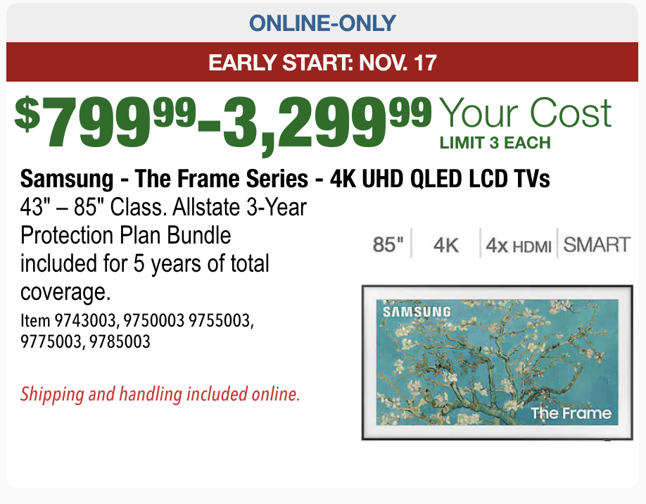 There are also Samsung Frame TVs on sale for prices between $799 and $3,299.99.
