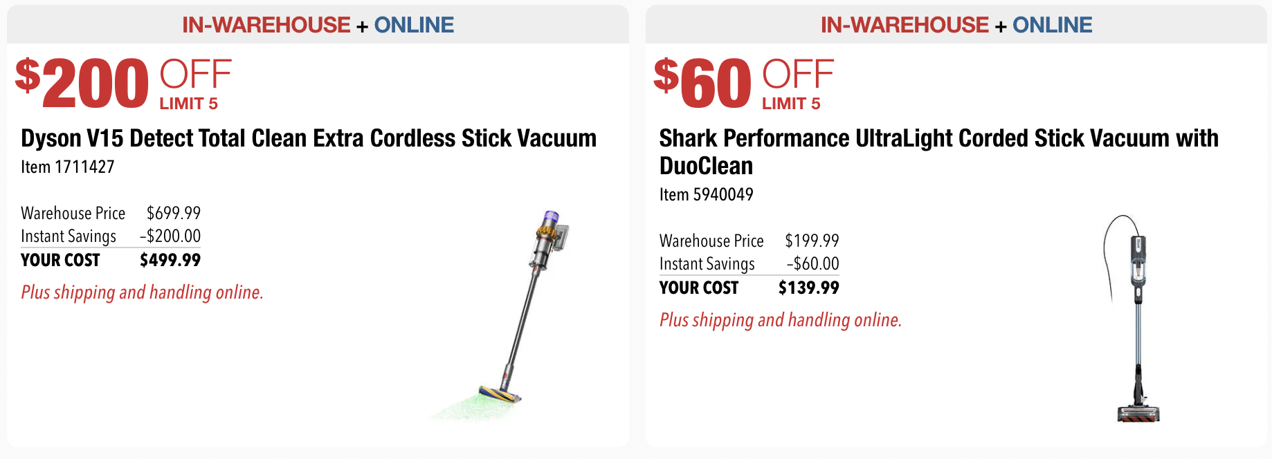 Both the Dyson V15 Detect Total Clean Extra Cordless Stick Vacuum AND Shark Performance UltraLight Corded Stick Vacuum with DuoClean will be on sale soon at Costco.