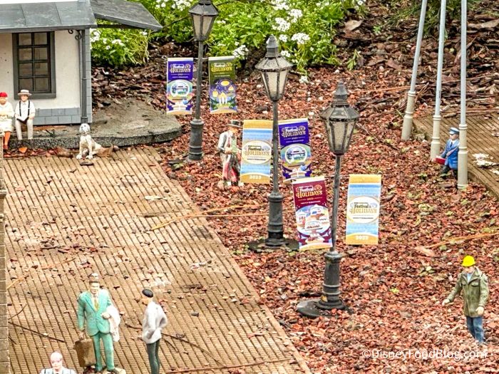 Pick up a bag of caramel popcorn from Karamell-Küche, and keep walking to the far right of the Germany Pavilion where you’ll find an adorable garden train display. It’s pretty much a tiny village! The residents of this tiny village love to celebrate EPCOT’s festivals and have now decorated their little town in the style of the 2023 International Festival of the Holidays.