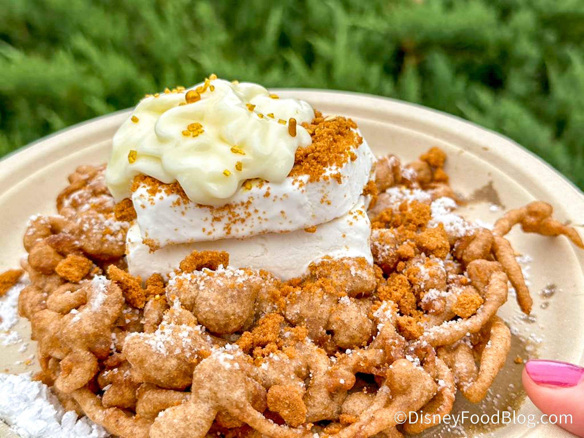 The Holiday Cinnamon Celebration Funnel Cake for $12 is topped with powdered sugar, vanilla ice cream, cinnamon cookie crunch, cream cheese whipped cream, and gold dust inspired by the culinary treasures of the Kingdom of Rosas in Disney’s all-new animated musical film, Wish.
