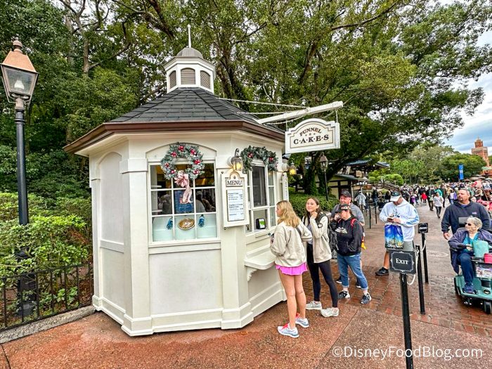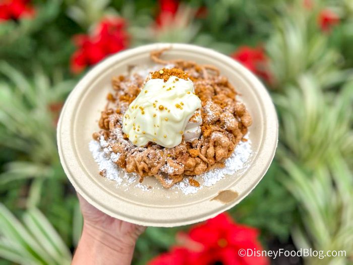 There’s so much to see and do and we’re covering it ALL LIVE for you. Most importantly, though, we’re visiting ALL the food booths to check out this year’s food because that’s what we do. So let’s head on over to the Funnel Cake stand at the American Adventure pavilion and see what this year’s holiday season brings.