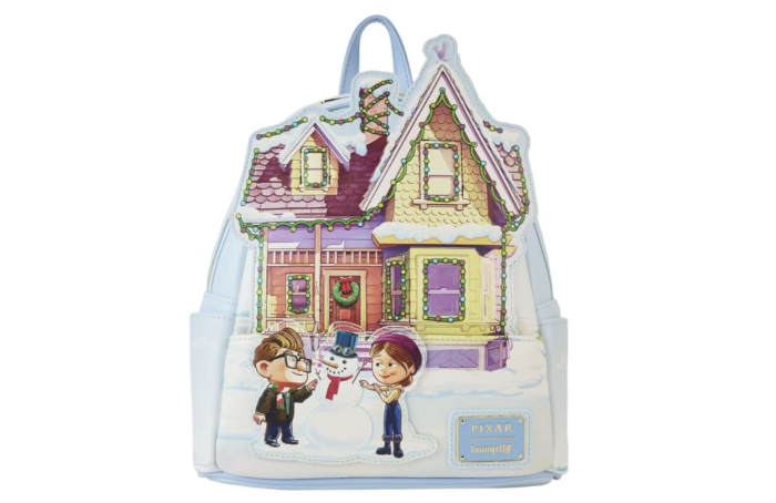 This Loungefly mini backpack features a youthful Carl and Ellie building a snowman in front of their house — all decorated for the Holidays!