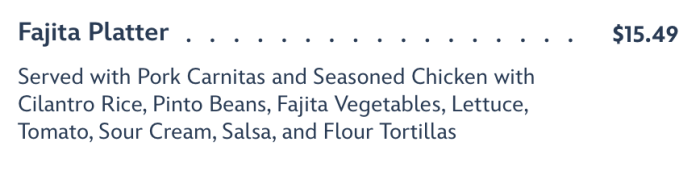 - Ensalada Hacienda description changed from “Arugula, watermelon, pumpkin seeds, toasted sesame seeds and queso fresco with a lime oregano vinaigrette” to “Chopped Romaine with jicama, queso fresco and cilantro-lime vinaigrette”