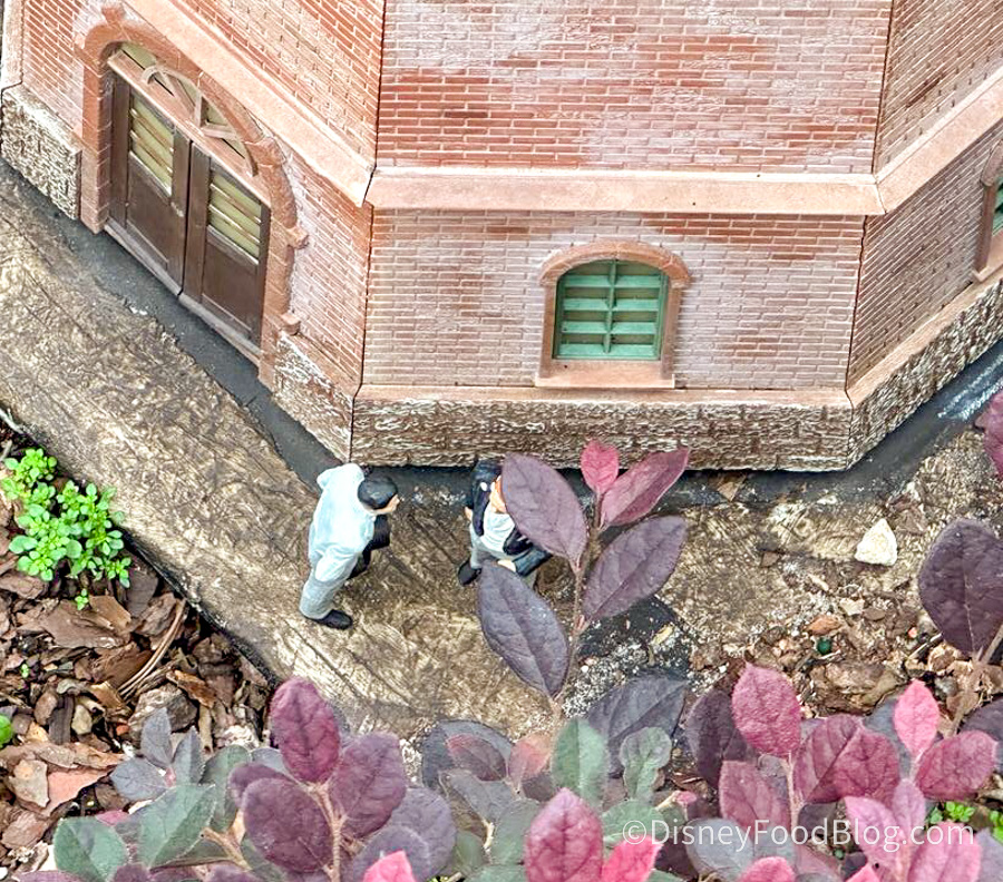 EPCOT’s Germany Pavilion is home to some of our favorite snacks, exciting entertainment, shopping, and a town under attack. Just take this seemingly abandoned train station for example. It’s clear that the tracks come to an end, making this station unusable — so what are those folks doing gathered on the platform? Perhaps this is a staging area for nefarious behavior. It also looks like someone is down by the tracks — a potential saboteur?