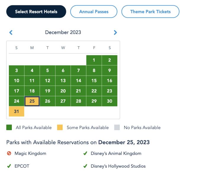 Magic Kingdom park passes are currently SOLD OUT on Christmas Day, December 25th, for people with theme park tickets and those staying at Disney World hotels. The other three Disney World parks — EPCOT, Disney’s Hollywood Studios, and Disney’s Animal Kingdom — still have availability on this day.