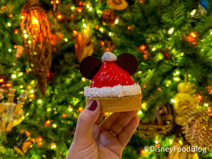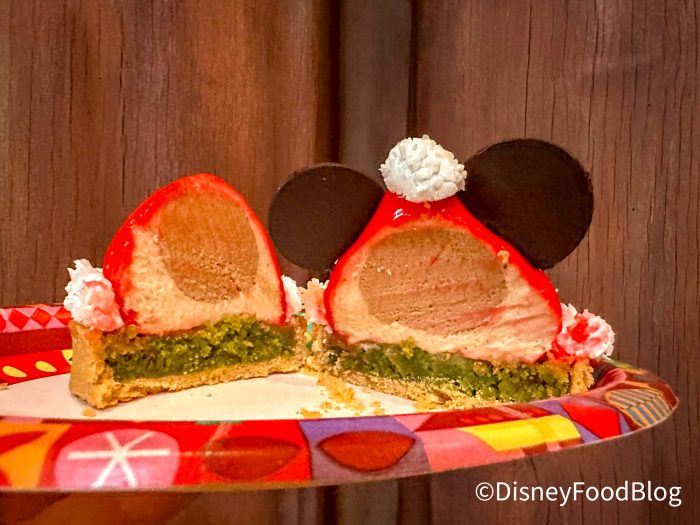 The Mickey Santa Hat Tart is a vanilla tart with pistachio cake, chai mousse, and caramel ganache. As you can guess, it has a lot of flavors competing for the spotlight.